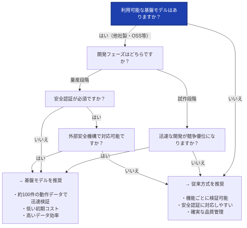 図1: ロボット開発における基盤モデル vs 従来方式の意思決定フローチャート
